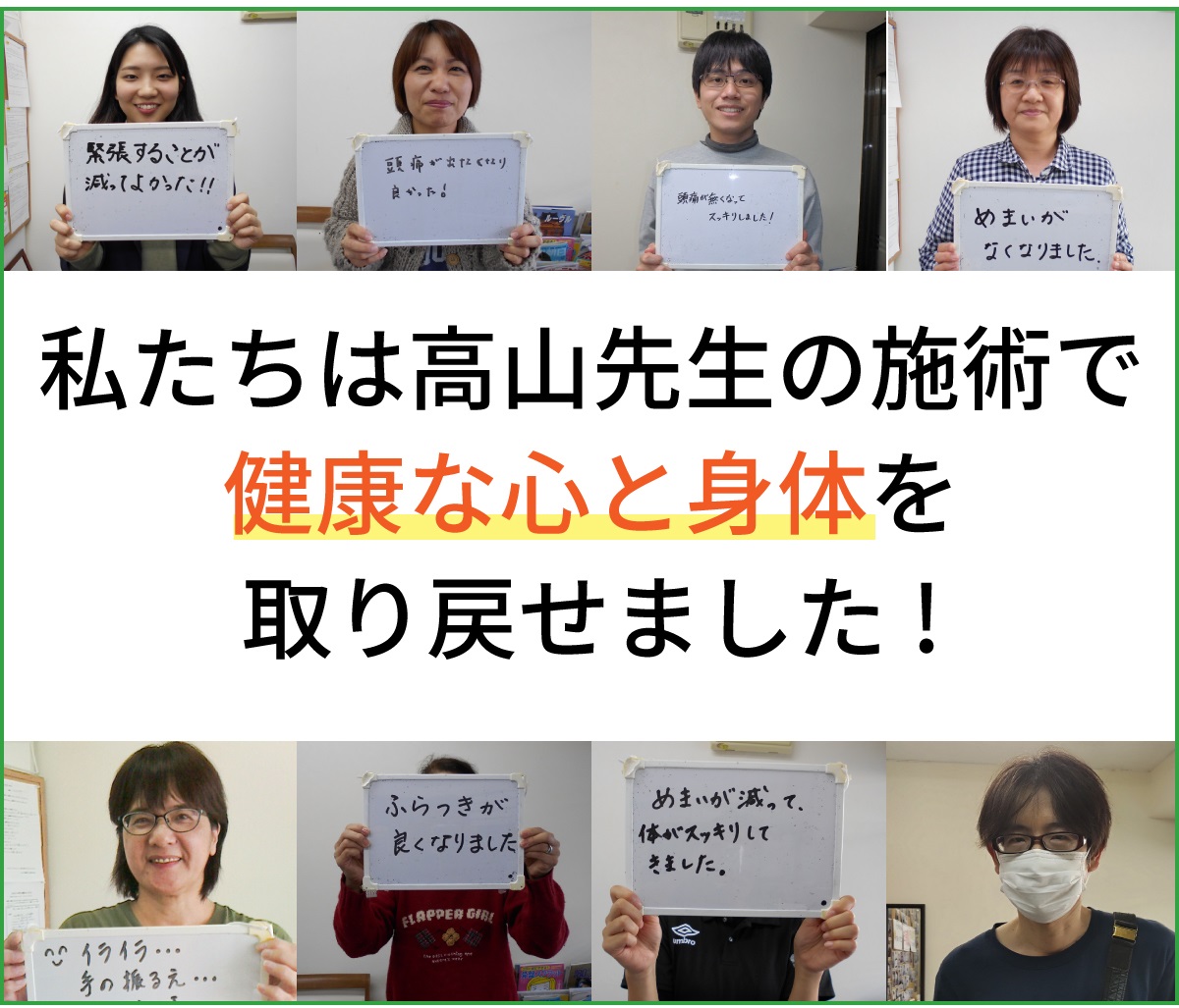 高山先生は精神面のことについても詳しく、初回施術中も丁寧に色々なお話をして下さり、閉鎖的空間に行ってみて「今日は大丈夫そうだ」を確認していたものの、(通ったのは10回以下だったと思いますが)もう確認することすら忘れているくらい気にならなくなっています!※個人の感想であり、効果を保証するものではありません